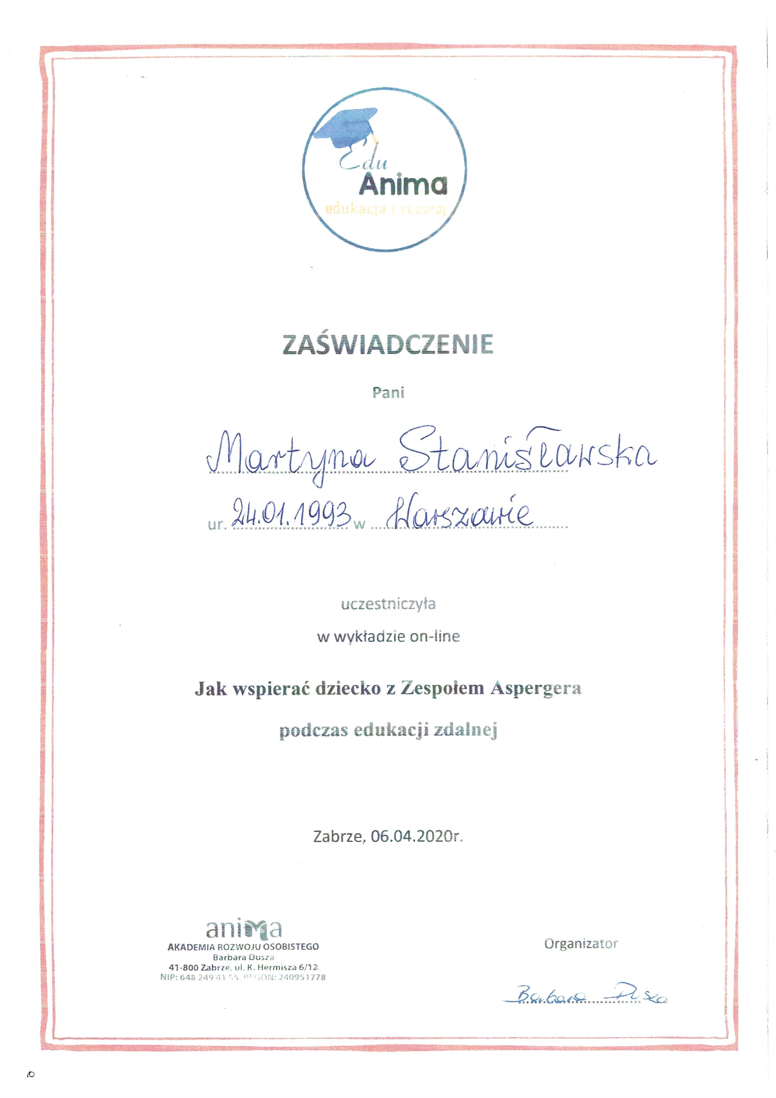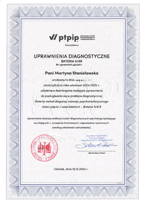 Ponadto ukończyłam studia podyplomowe z zarządzania w oświacie, szereg kursów i szkoleń z zakresu m.in. Treningu Umiejętności Społecznych, narzędzi diagnostycznych tj.: bateria metod diagnozy przyczyn niepowodzeń szkolnych SB6/18, bateria diagnozy rozwoju psychomotorycznego dzieci pięcio- i sześcioletnich (bateria-5/6R), KORP, PEP-R, bateria metod diagnozy dyskalkulii; oraz z zakresu bajkoterapii i dogoterapii. Posiadam uprawnienia do przeprowadzania diagnozy funkcjonalnej dziecka z wykorzystaniem narzędzia diagnostycznego PEP-R.